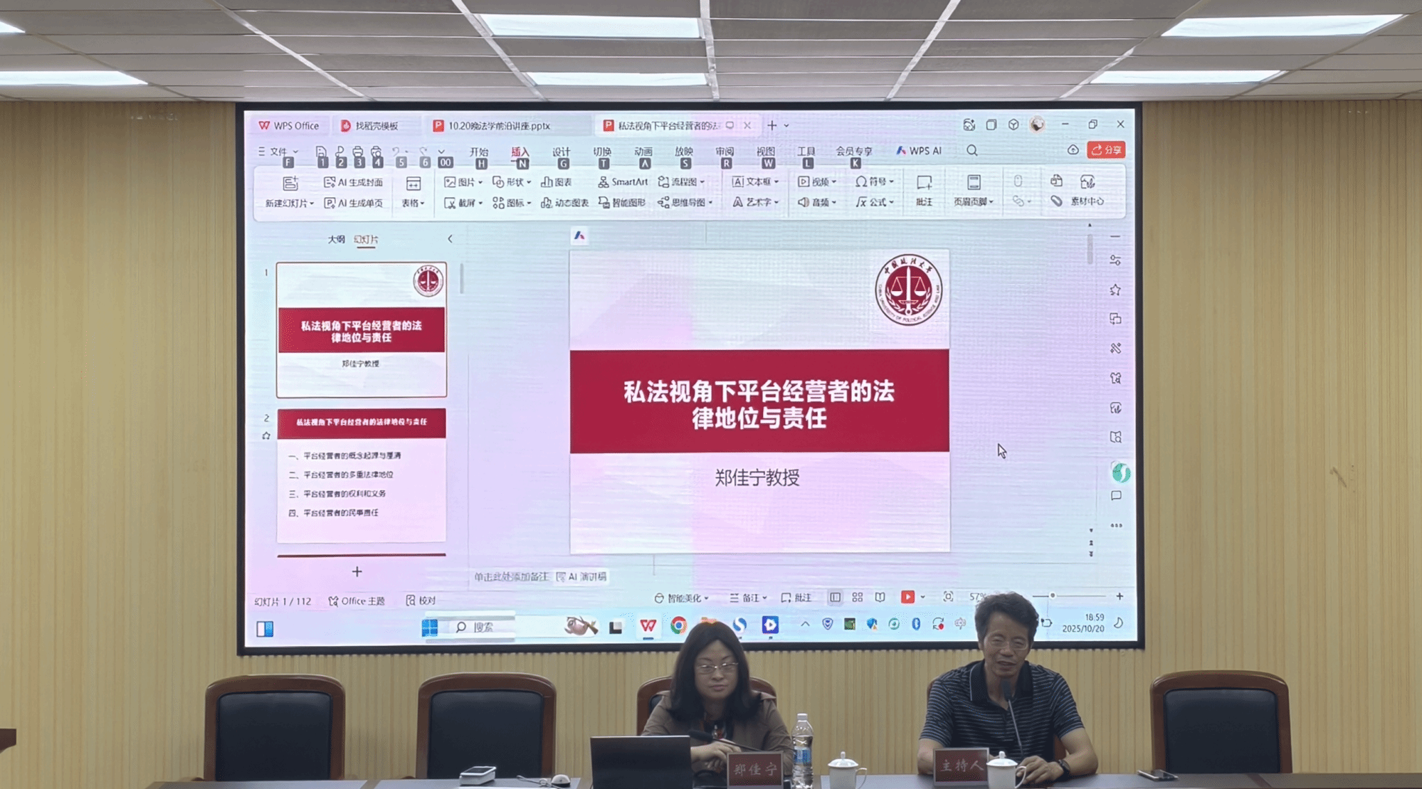 2025年10月20日晚,中国政法大学民商经济suncitygroup太阳集团教授、博士生导师、商法研究所副所长郑佳宁教授,应邀在太阳成集团北校区suncitygroup太阳集团301会议室作题为“私法视角下平台经营者的法律地位与责任”的专题讲座。讲座由suncitygroup太阳集团赵金龙教授主持并致欢迎词,众多师生到场聆听,现场气氛热烈。