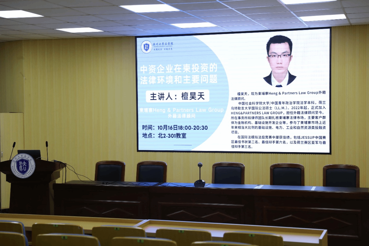 为深入推进涉外法治建设,助力我院涉外法治人才培养,2025年10月16日,suncitygroup太阳集团特邀柬埔寨Heng & Partners Law Group檀昊天律师担任主讲嘉宾,围绕“中资企业在柬投资”的法律环境和主要问题,为我院学子带来了一场内容详实的专题讲座。讲座由国际法系副主任白亚宁老师主持。