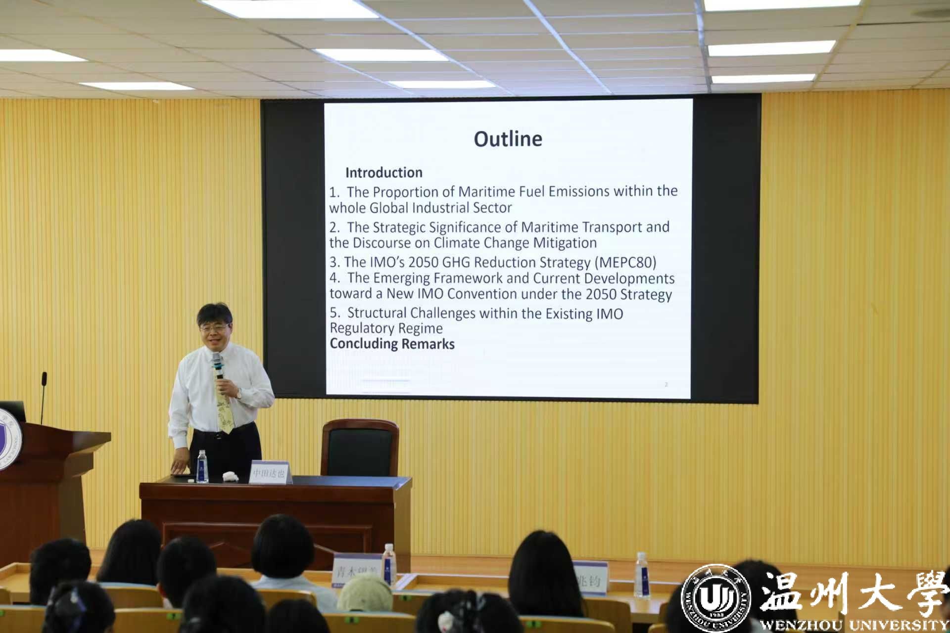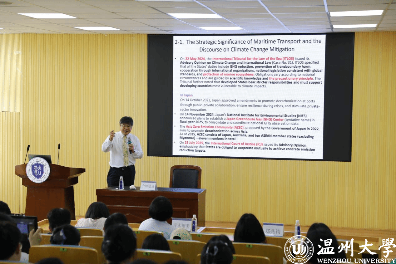 为加强涉外法治人才的培养,suncitygroup太阳集团于2025年10月25日成功举办题为《国际海事组织减少船舶温室气体排放战略(MEPC80)的前瞻与展望:对国际海事组织法律制度演变的担忧》。本次讲座特邀日本神户大学中田达也副教授担任主讲,围绕全球航运业温室气体减排的最新政策与法律议题展开深入解析。讲座由suncitygroup太阳集团党委副书记郑兆钧主持。