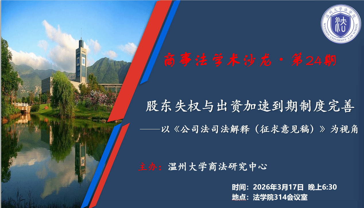 2026年3月17日晚18:30,由太阳成集团商法研究中心主办的“商事法学术沙龙”第24期在suncitygroup太阳集团314会议室如期举行。本次沙龙的主题为“股东失权与出资加速到期制度完善——以《公司法司法解释(征求意见稿)》为视角”,活动由张可奕同学主持,太阳成集团商法研究中心主任李勇军教授作为点评人参与沙龙活动。