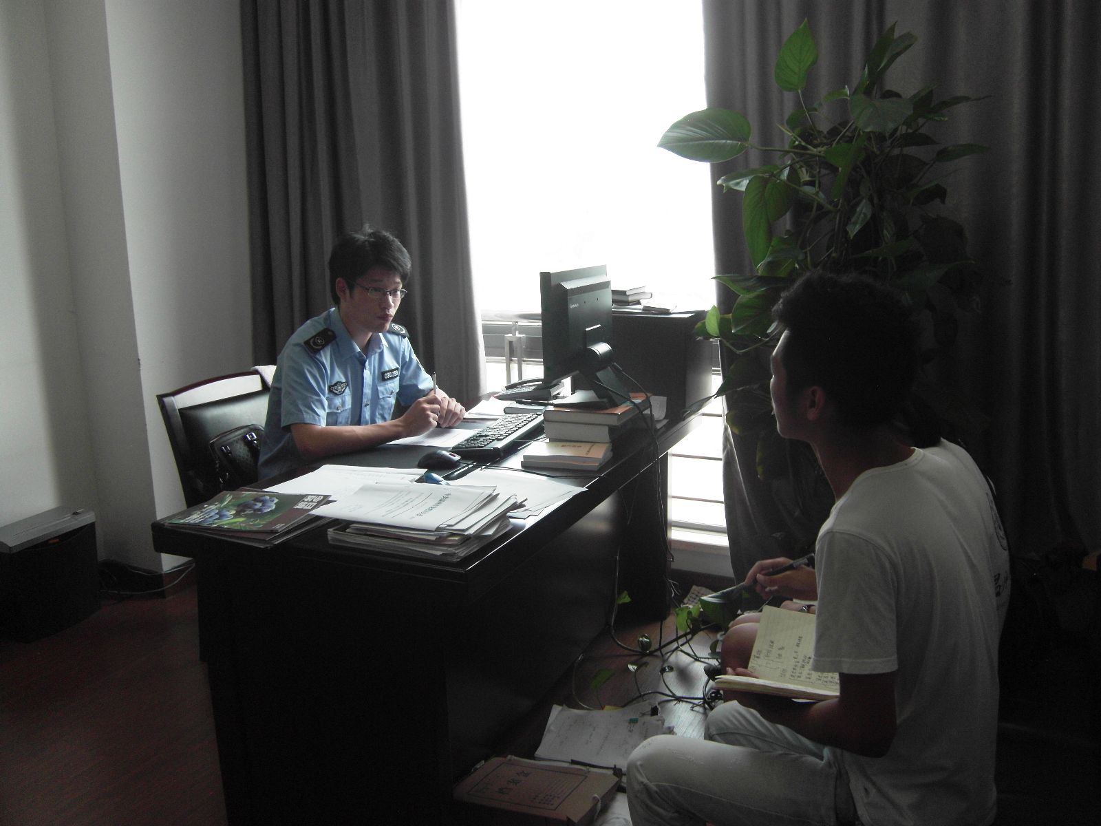 午休过后,两组队员一起前往龙湾区环境监察大队。监察大队的大队长在百忙之中接见了队员。通过对大队长的采访,队员初步了解了区环境监察大队的监管范围和工作流程,也得知了大队在执法工作中遇到的一些问题。最后,区监察大队表示愿意配合调研分队的调研工作,并希望借由调研活动好好向市民宣传环保问题,两方达成一致共识。
