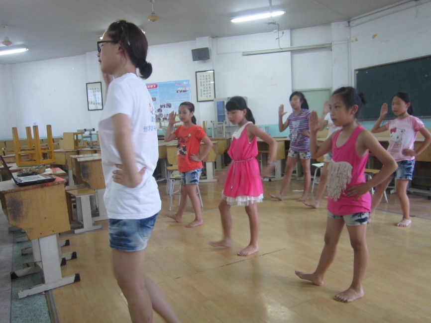 周一,是一个朝气蓬勃的开始。昨天的暴风雨刚过,今日的凉爽可想而知。早上,孩子们在操场上欢快的做着早操,小嘴哼哼唧唧,跟着音乐一起舞动。虽是做不到井井有条,整齐划一,但活泼好动,诚意十足,目光绚烂,尤为纯真。下午的时装秀正式进行了排演,孩子们走得很有小明星的范,一个接一个,姿势时尚可爱,憨态可掬。其中几个调皮的男孩子特别搞怪,常常让志愿者笑得前仰后合。最后是弟子规的舞蹈排练,由志愿者在前面带舞,孩子们在后面跟着,一个一个动作,耐心的教导,细心的改正。晚上,志愿者们到汇演室布置场地,将桌椅一一摆放整齐,各归各位。