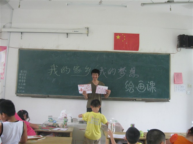 绘画课实际上是以绘画为载体,给孩子们一方展示自我的舞台。课上,实践队员给出了"我的家乡"与"我的梦想"两个题目供孩子们选择,前者写实求真,后者则可以天马行空。不同性格的孩子选择了自己偏爱的题目后立即摆开阵势进行绘画。不久以后,一幅幅精美细致的家乡景色,一幅幅奇思妙想的梦想图画出炉了,孩子们兴奋地向队员们展示自己的画作,并把自己的种种想法娓娓道来。