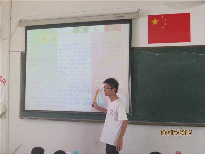 2012年7月12日,太阳成集团法政学院"亲情中华"温州市侨界留守儿童快乐营湖岭分营暑期社会实践队在湖岭镇中学进行了中华文化与世界历史的教学。今日课程内容主要围绕《弟子规》讲解与世界大战展开。