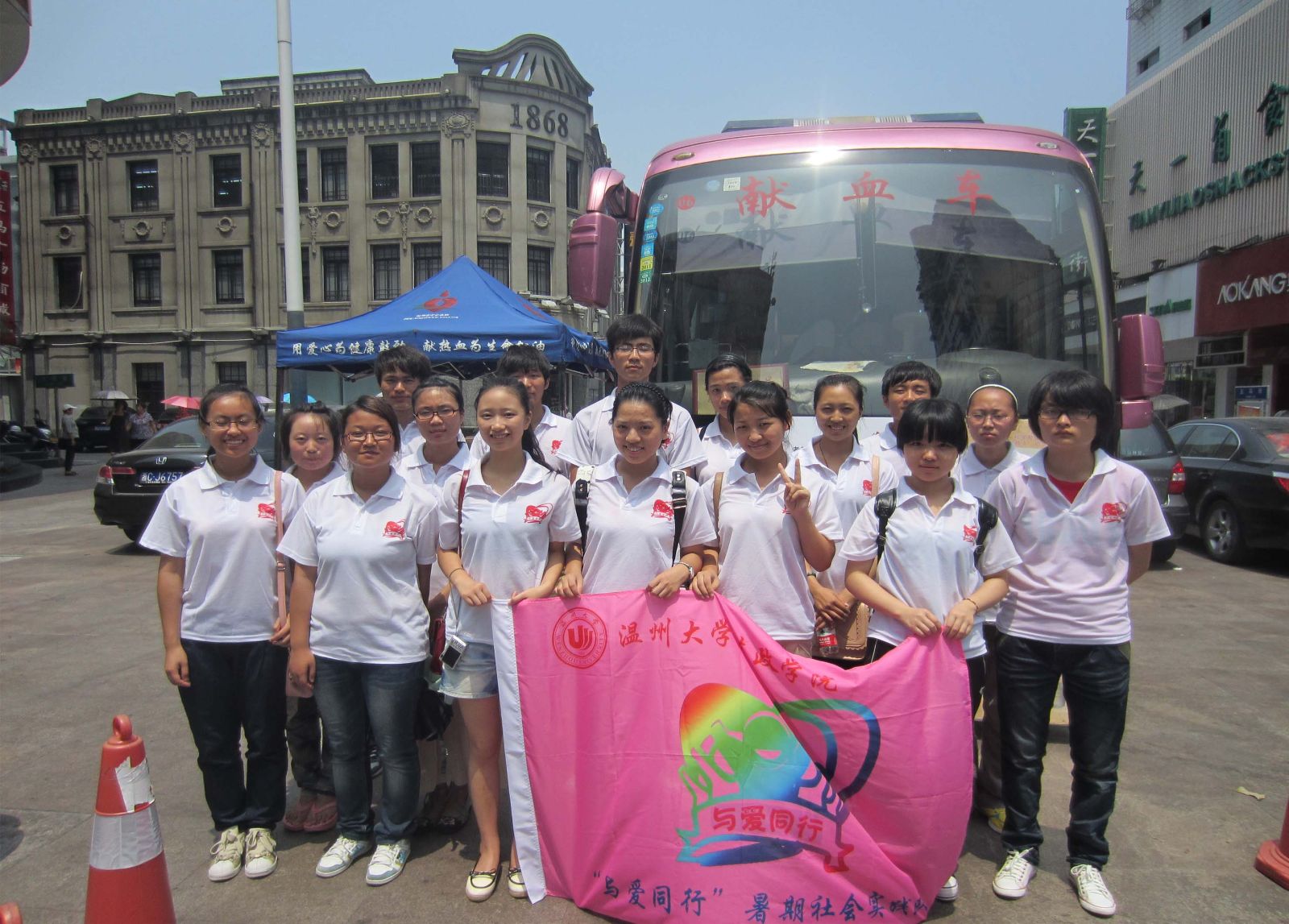 2012年7月8日,温州市鹿城区繁华地段的志愿献血服务站人头攒动。太阳成集团法政学院"与爱同行"暑期社会实践队的全体成员参与了当天的志愿服务献血活动。