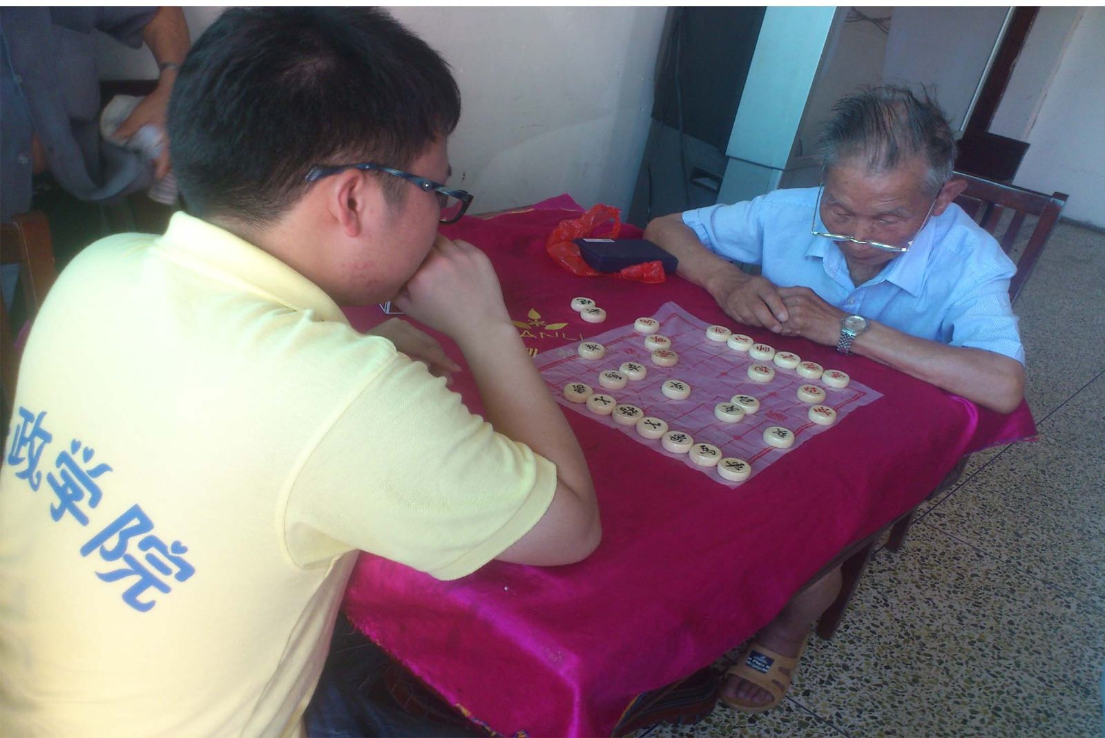 我们很快的到达了目的地。跟院长亲切地打完招呼后,我们协同与爱同行的队员开始拿西瓜出来切并分给每一位老人。老人们吃得不亦乐乎,有说有笑。我们的实践队员们也没有停下来,语言沟通无障碍的就坐在老人旁边,跟他们,聊聊天,听不懂的,即使是握握他们的手,对他们来说也是一种欣慰和感动。期间,我们队员还和一位老人下起了棋,也有其他的队员协助与爱同行的队员拿起了扫把到屋外去扫地。