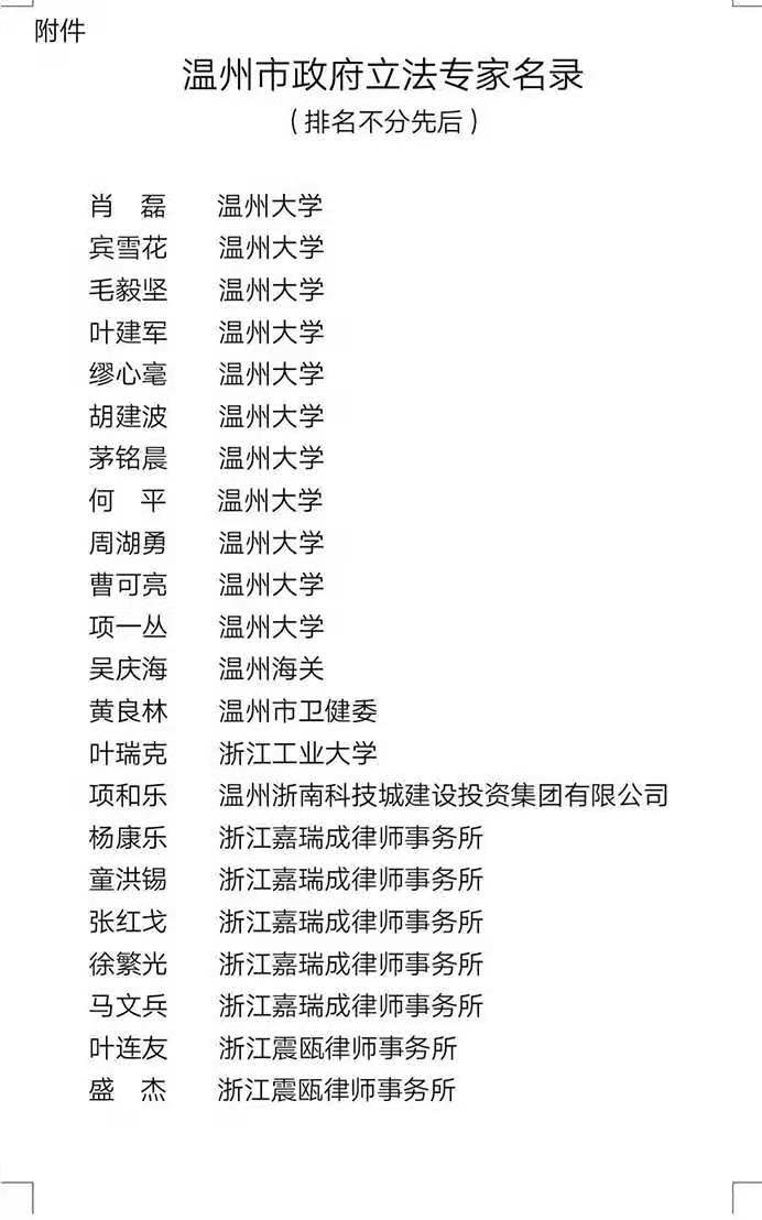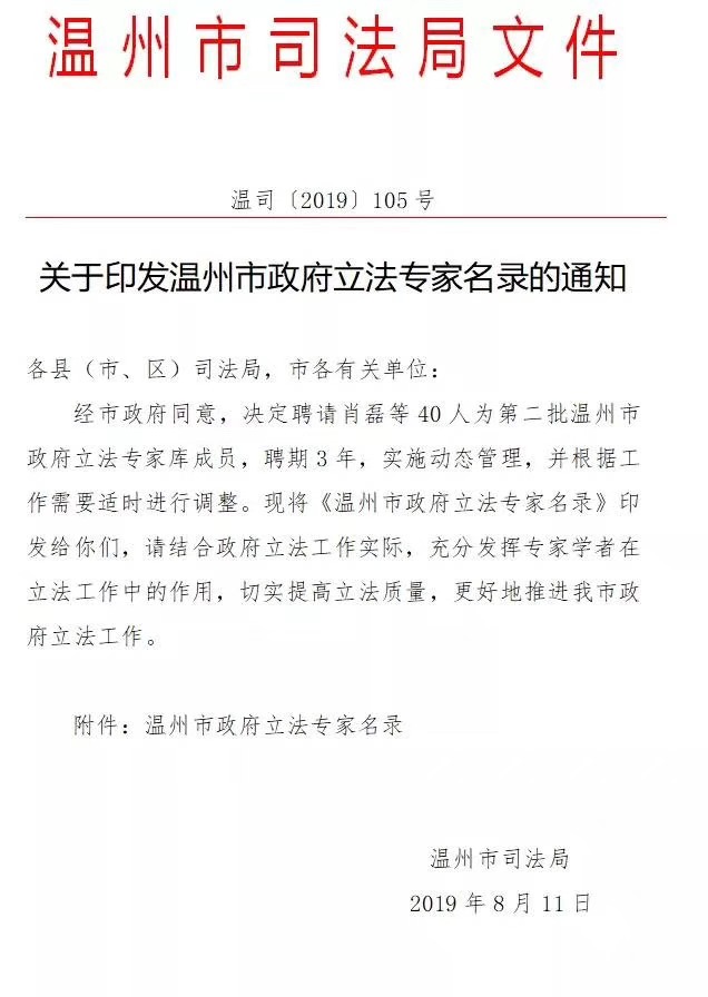8月11日,温州市司法局公布印发第二批温州市政府立法专家名录,我院肖磊、宾雪花、缪心毫、胡剑波、茅铭晨、何平、周湖勇、项一丛等8名教师成功入选。