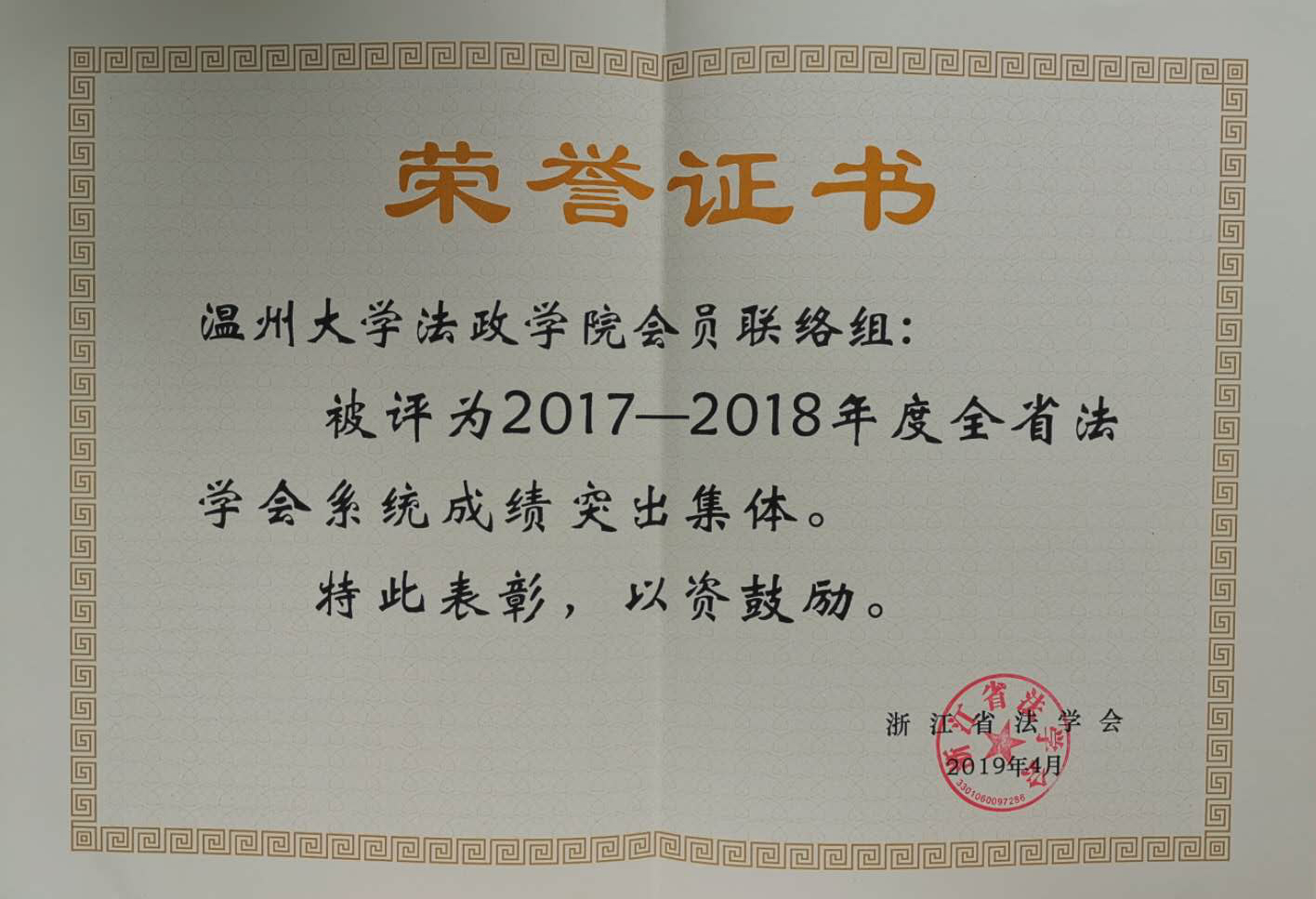 喜报:2019年4月,浙江省法学会为发挥先进典型示范引领和激励作用,推动我省法学事业新发展,决定对省内成绩突出集体和个人通报表扬,我院会员联络组被评为“2017-2018年度全省法学会会系统成绩突出集体”。相信学院会再接再厉,在开展法学研究、法治实践和法律服务方面再创佳绩。