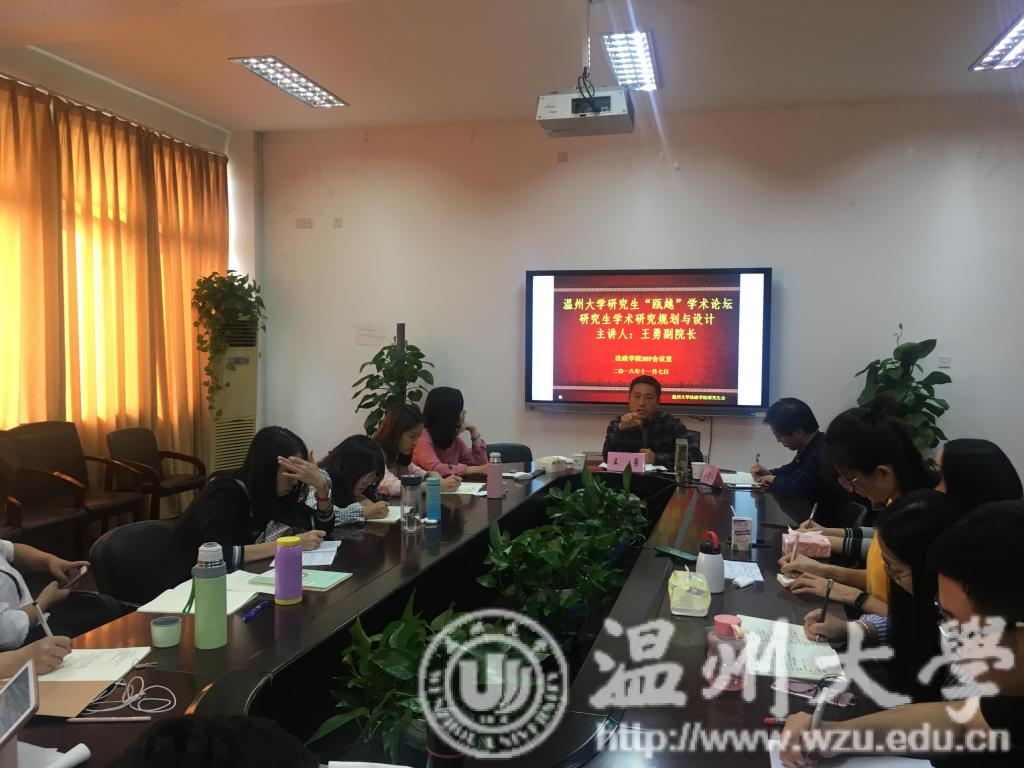 2018年11月7日下午14时,太阳成集团研究生“瓯越”学术论坛在法政学院学院307教室举行。此次论坛由法政学院王勇副院长主讲,由法政学院研究生辅导员邓昌云老师主持,法政学院2017级及2018级部分研究生参加了本次讲座。本次论坛主要从如何安排研究生学习生活、如何研究性学习以及如何申报课题三个方面展开讨论。