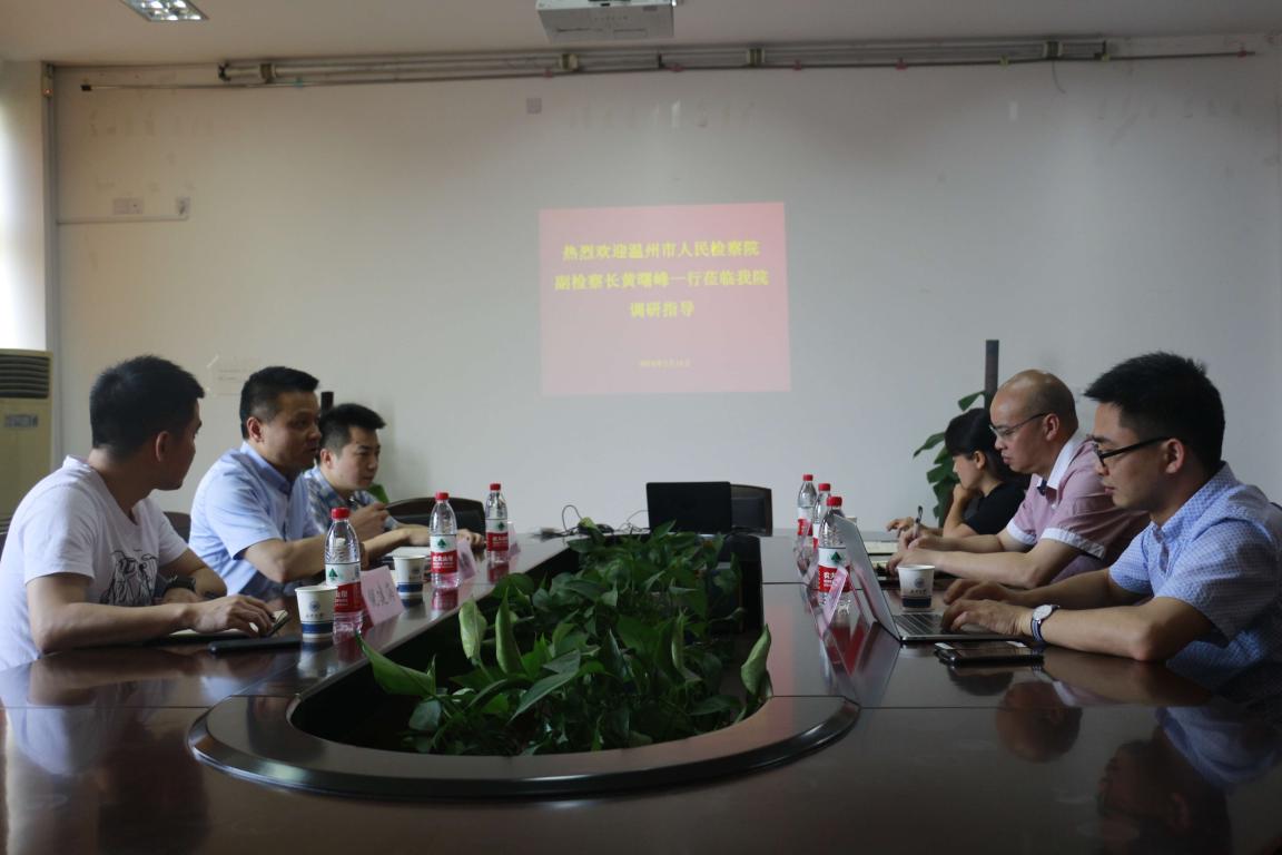 2018年5月16日上午,温州市人民检察院党组副书记、副检察长黄曙峰在市检技术信息化部主任金传拉等的陪同下来我院考察交流,我院王宗正院长、缪心毫副院长、法学系何平主任等与来访嘉宾进行座谈,共商合作事宜。