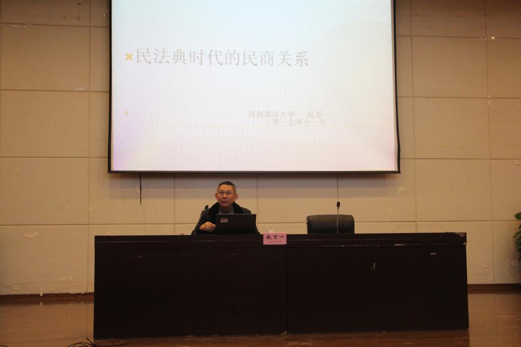 讲座中,赵万一教授首先从民法典的重要性讲起,主要集中讲了三个问题:一是民法基本原则的内容,如民事权利神圣原则、平等原则、自愿原则;二是民法总则规定对具体民商事法律设计的不同影响(在商法中的可能例外适用),如公平原则、平等原则、交易安全原则;三是民法典时代如何处理民商关系。赵教授又谈及后民法典时代商法的出路和对策,内容有:(一)在制定民法典的同时,加强对商事基本法的修改与完善(典型的如公司法,证券法,破产法):(二)强化商法与市场经济的关系,确立商法的市场经济基本法地位;(三)强化商法的社会经济活动引领功能,充分发挥商法对社会经济关系的规范作用(以P2P、私募基金、ICP为代表的新型金融活动,以网上交易、物联网为代表的新型营商行为);(四)充分发挥商法对国家发展战略的服务作用,凸显商法的国际化色彩(一路一带,商事仲裁);(五)高度重视商法伦理和商人道德的建设工作,充分发挥商法对市场经济的道德引领作用;(六)推进商事审判独立化,充分发挥商事审判、司法解释对商法的助推作用。
