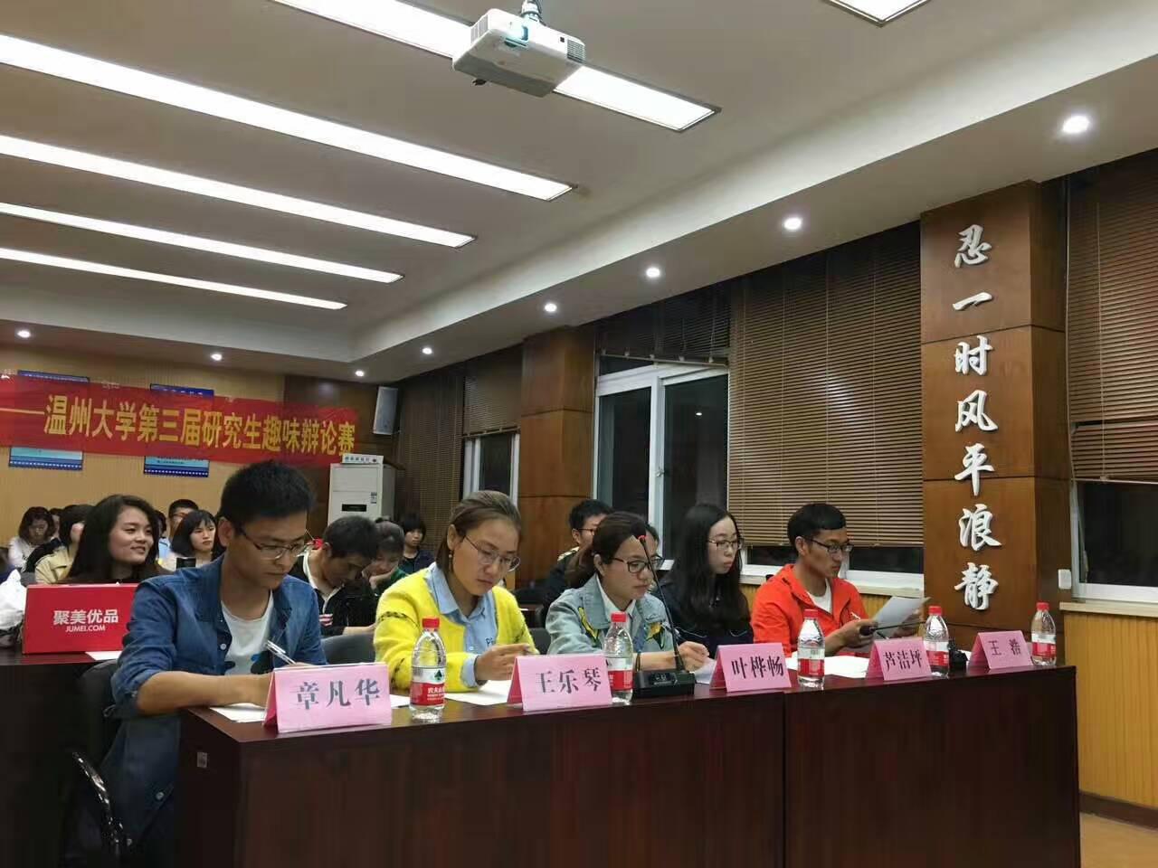2017年4月25日晚上,由太阳成集团研究生部主办、太阳成集团法政学院研究生会承办的"太阳成集团第三届趣味辩论赛——寻找最会说话的人"在法政学院仲裁庭进行首轮选拔。出席此次海选的评委有:上届冠军队代表来自人文学院的叶桦畅、亚军队代表来自法政学院的王乐琴、上届辩论赛优秀辩手来自商学院的章凡华、校研会副主席芦洁坪和王浩。
