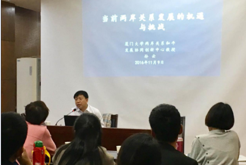 2016年11月9日,我院荣幸邀请到著名学者、厦门大学台湾研究院博士生导师、厦门大学两岸关系和平发展协同创新中心重大理论平台执行长孙云教授,就"当前两岸关系的机遇与挑战"问题,与本院师生进行学术交流。讲座在法政学院一楼报告厅举行,吴玉宗教授担任主持人,王勇副院长、付翠莲教授、徐旭东、朱婉菁等老师参加了此次学术活动。