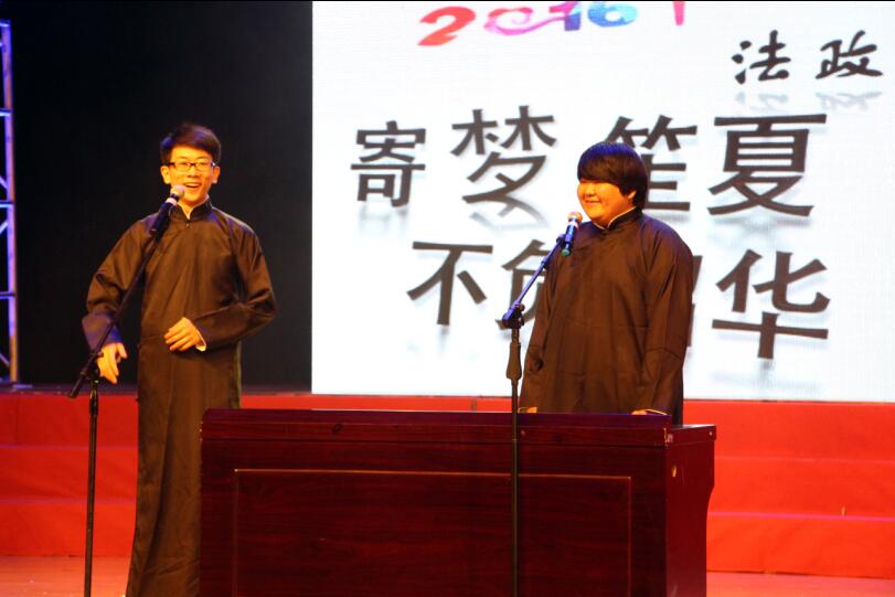 王杰、尹钰担任。法政学院领导、师生齐聚一堂,用一幕幕饱含深情的演出,诉说着心中难以掩藏的情愫。老师、同学陆续到达后,大屏幕上开始播放视频,屏幕上出现的是曾经不以为意、现在却看到落泪的一幕又一幕,勾起大四学子们对青春的回忆。活力动感的开场舞《给力青春》结束后,主持人宣布晚会正式开始。