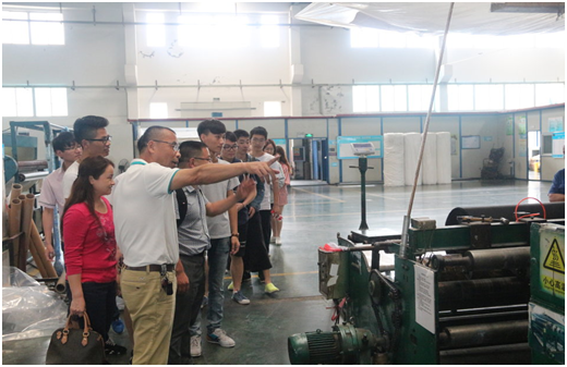 全体同学在王勇、何平和周湖勇三位老师的带领下来到位于藤桥的温州新宇无纺布有限公司见习。