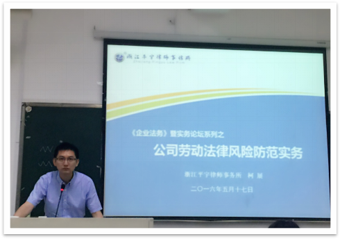 2016年5月10日晚六点半,浙江平宇律师事务所柯展律师通过理论结合实践案例的方式为我们带来了一场以"公司劳动法律风险防范"为主题的精彩讲座。