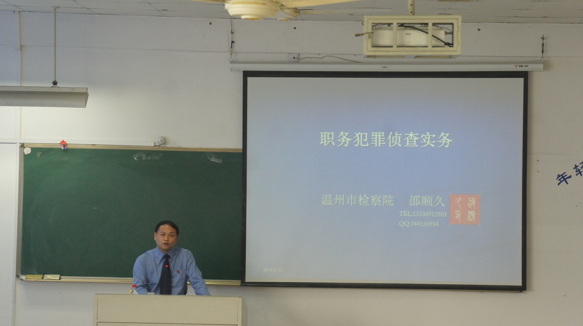 邵检察官首先给同学们介绍了下温州市检察院的部门设置,然后问大家"哪些部门有侦查权?",大家一边思考刑事诉讼关于侦查权分配的基本理论一边回答之前的课程中提到的公诉人的侦查权,邵检察官对大家的答案给予评析并告诉大家除了公诉人的侦查权、反贪部门的侦查权,反渎部门也有侦查权,今天他就来讲讲反渎部门的侦查实务,轻松幽默的语言就把大家带入今天的主题。然后,邵检察官从反贪局与反渎局的不同讲授二种职务犯罪侦查实务的差异,并结合近几年我国反腐败的现状和发展态势,分析渎职类职务犯罪侦查实务的主要特点,如案件的来源、审讯的方法、大数据时代的侦查技能、抓捕的注意事项等等。最后,邵检察官通过自己亲自办理的几起案件解释了以上几项实务方法的具体操作,同学们从险象环生的真实案件中了解反渎职部门侦查工作的不易,更为邵检察官的灵活机智鼓掌致敬。