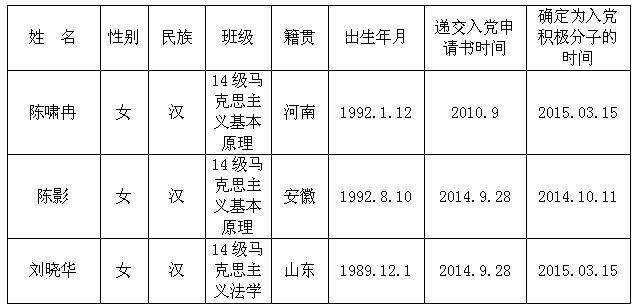 经中共太阳成集团法政学院研究生党支部培养考察,认为以下同志(具体名单附后)已基本具备中共预备党员条件,拟于近期发展,现予以公示。
