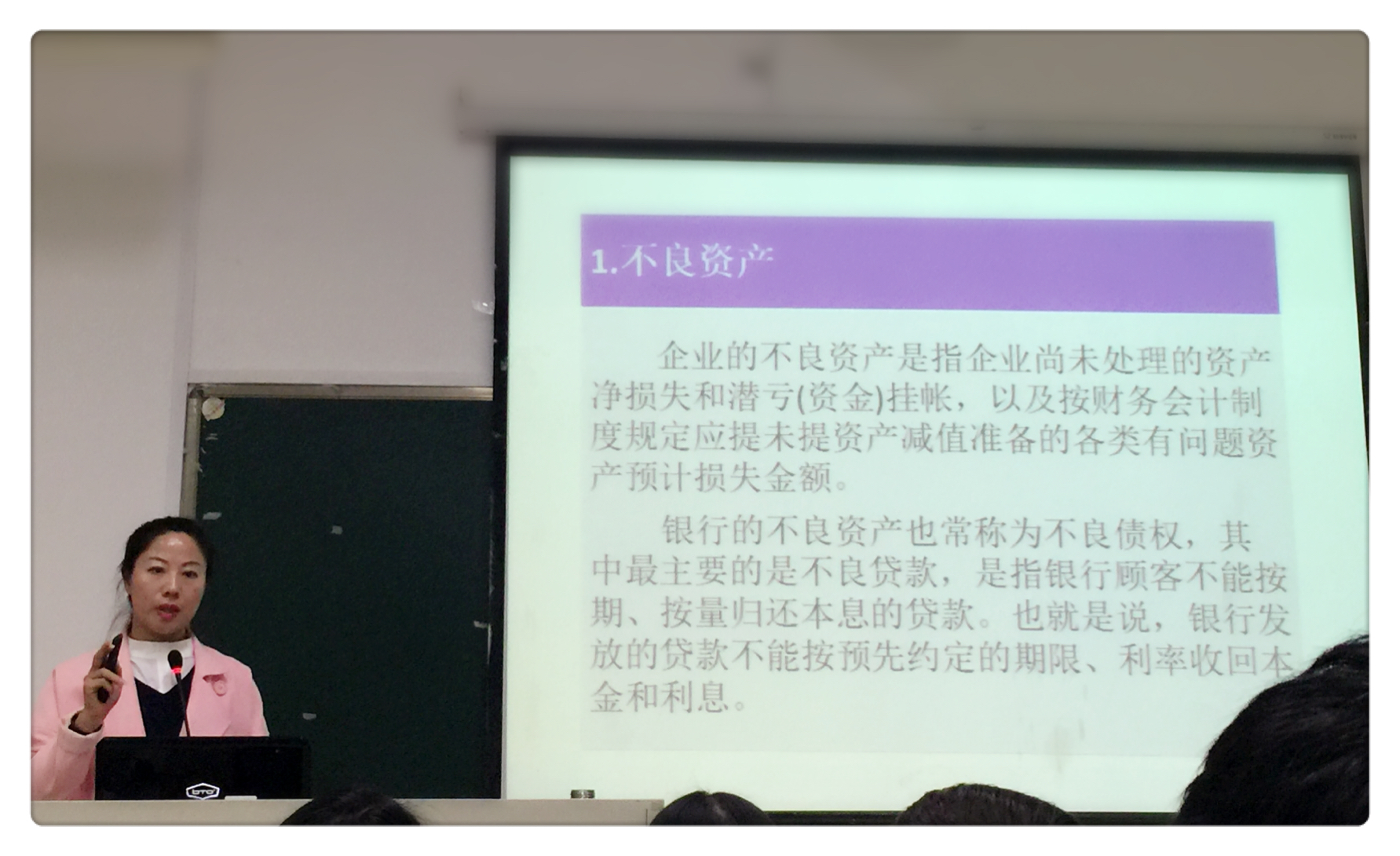 由于我们对"不良资产"的相关理论知识较为陌生,于律师首先引入不良资产及其相关术语帮助我们构建一定的理论基础。不良资产可概括为企业的不良资产与银行的不良资产。于律师主要就银行不良资产展开,明确不良贷款的范围后,针对80年代以来我国几大商业银行已留下巨额不良资产为背景,具体且深入地向我们介绍了我国现阶段处置不良资产的手段、方法。随后,于律师又向我们传输了一些较具实务性的知识:投资者参与不良资产领域的方式以及债权人与老赖搏斗的基本技能。我国投资者购买债权的现状主要存在以下问题:没有大资金、大机构介入;没有规模化、产业化经营,零敲碎打试运作;从业者分散、各自为政;地区发展不平衡。因此,不良资产证券化的发展道路上不能缺少律师的参与和引导,这也为我们这些法学的莘莘学子提供了一个良好的就业平台。一个半小时的演讲虽然短暂,但于律师所传授给我们的知识与精神仍值得深思。