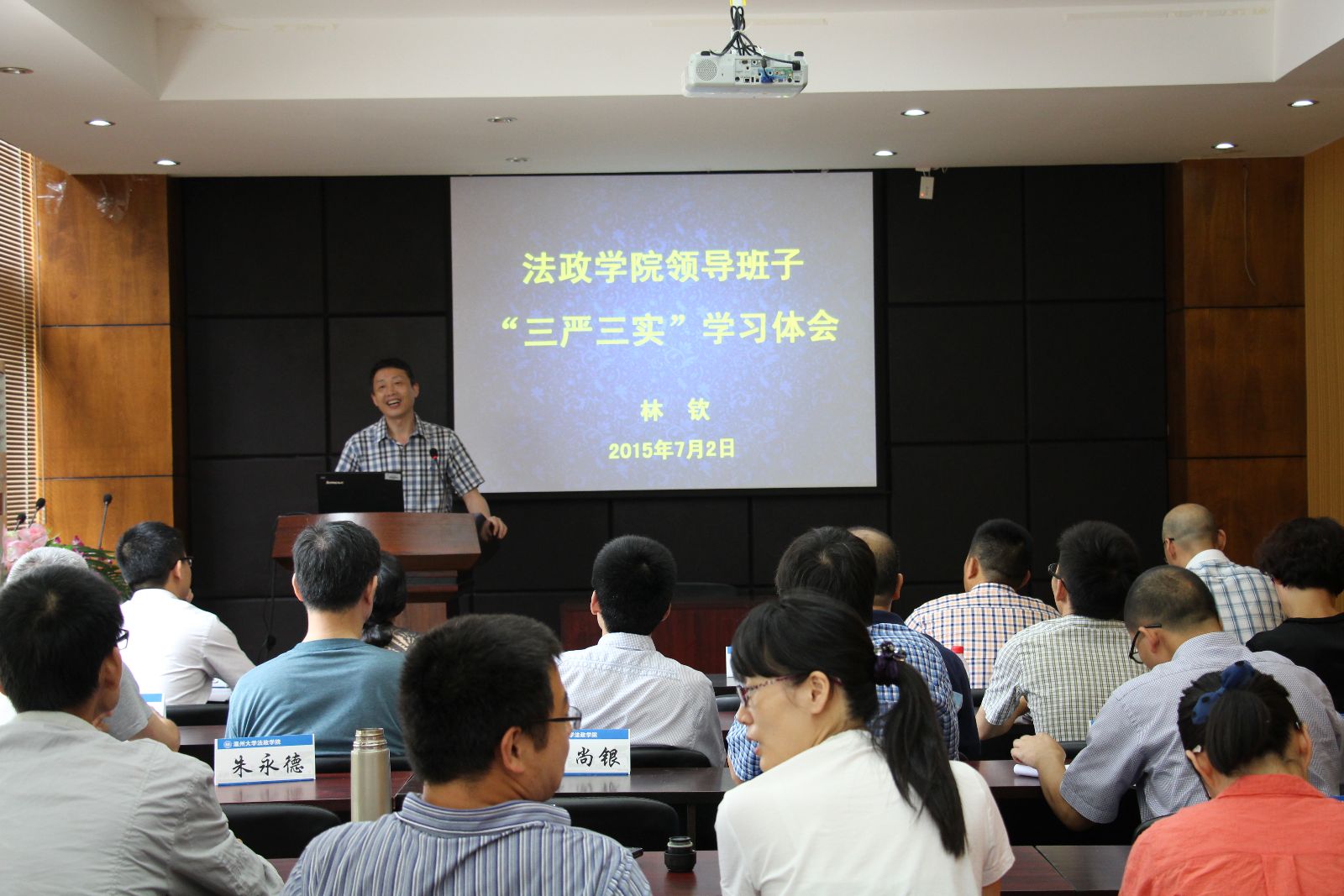 2015年7月2日下午法政学院全体教职工对习近平总书记就深入推进作风建设,对各级领导干部提出"严以修身、严以用权、严以律己,谋事要实、创业要实、做人要实"的精神进行深入学习。会议由王宗正院长主持,林钦书记做主题报告。