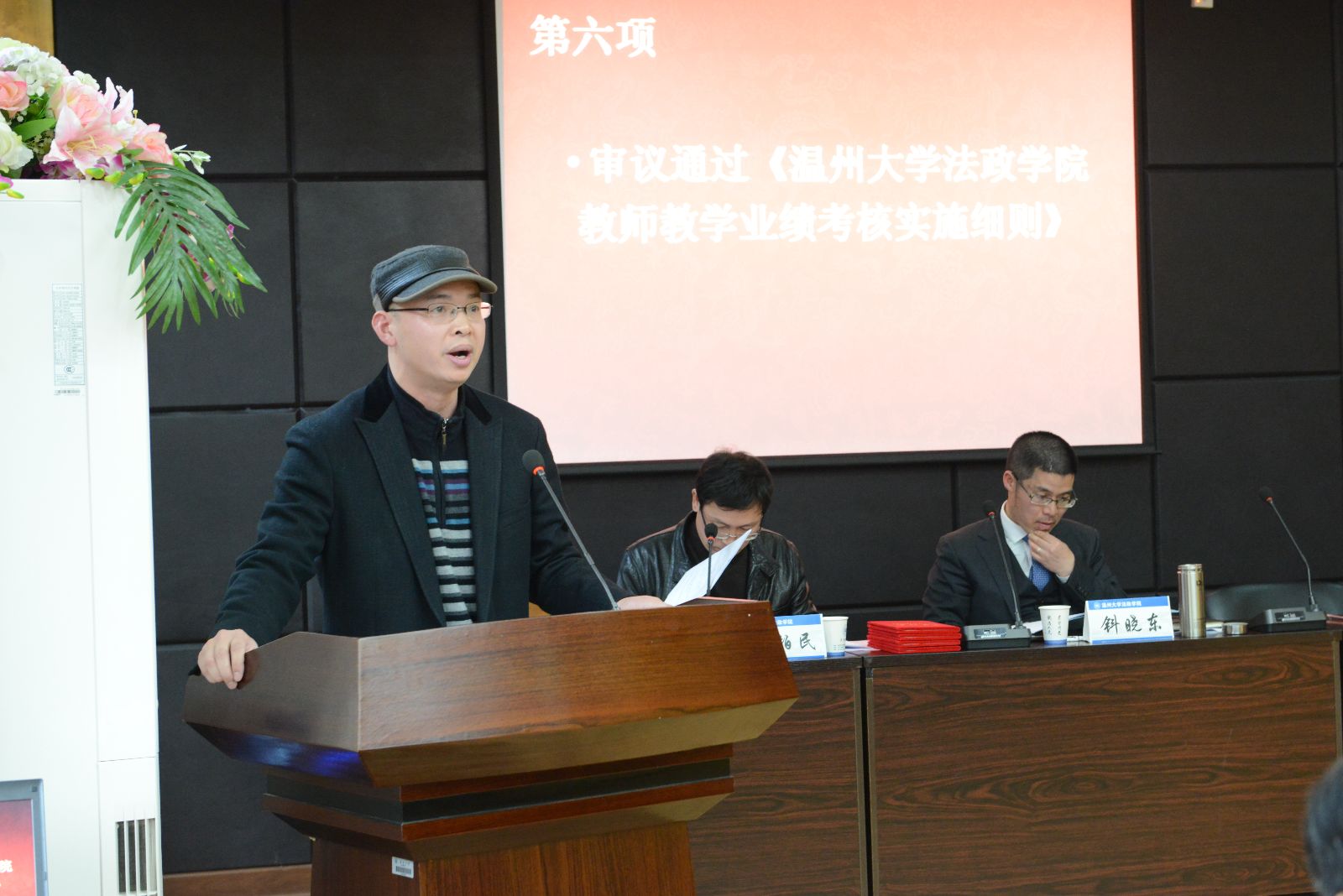 王宗正副院长对《《太阳成集团法政学院教师教学业绩考核实施细则(征求意见稿)》进行了简要的分析和说明。全体代表通过举手表决审议通过了学院教师教学业绩考核实施细则。