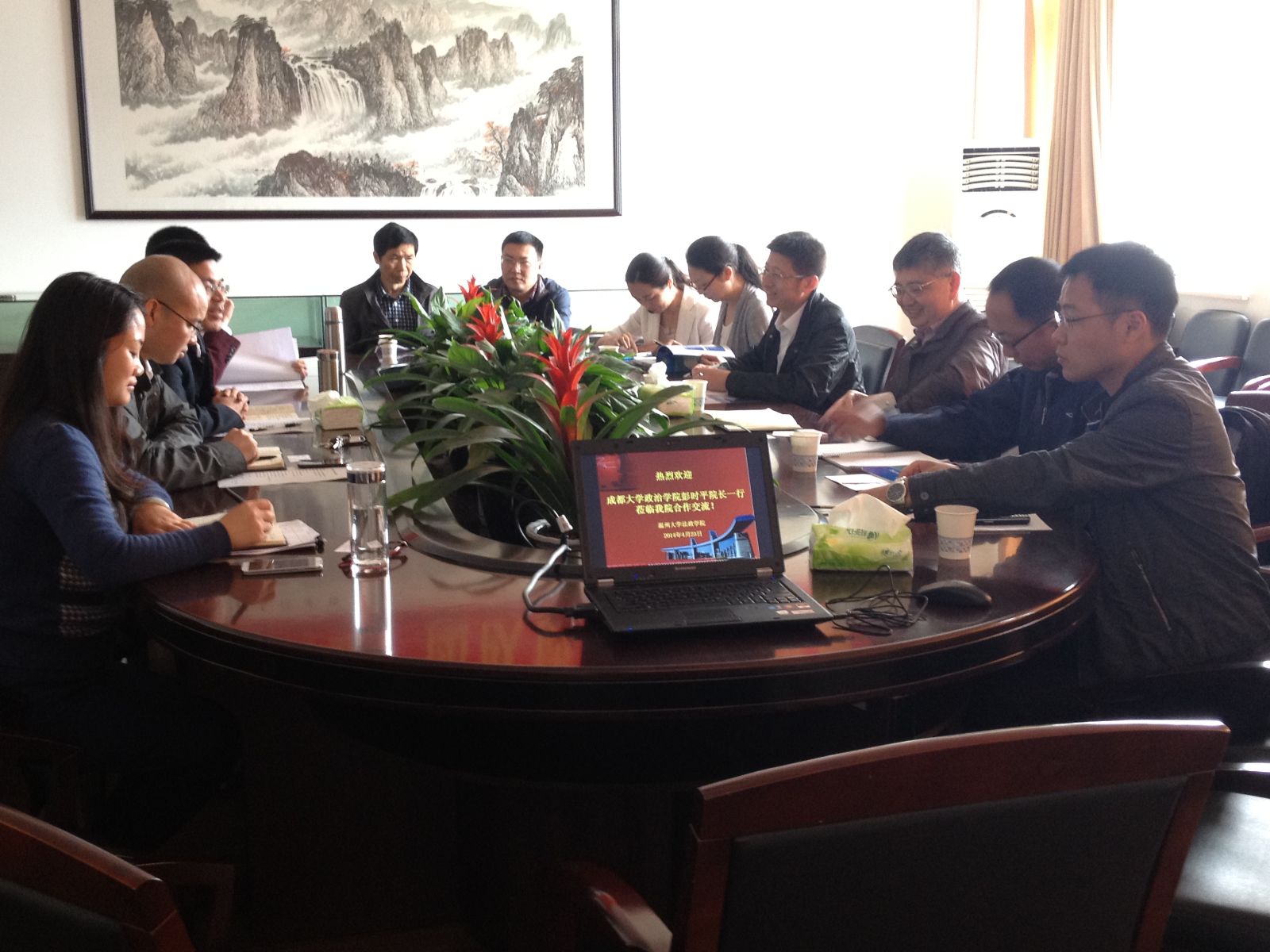 彭时平院长对学院的支持表示衷心感谢,对学院取得的成绩表示赞赏。他介绍了成都大学政治学院在专业设置、学科建设、学生培养、科研管理等具体举措及取得的成绩和经验。