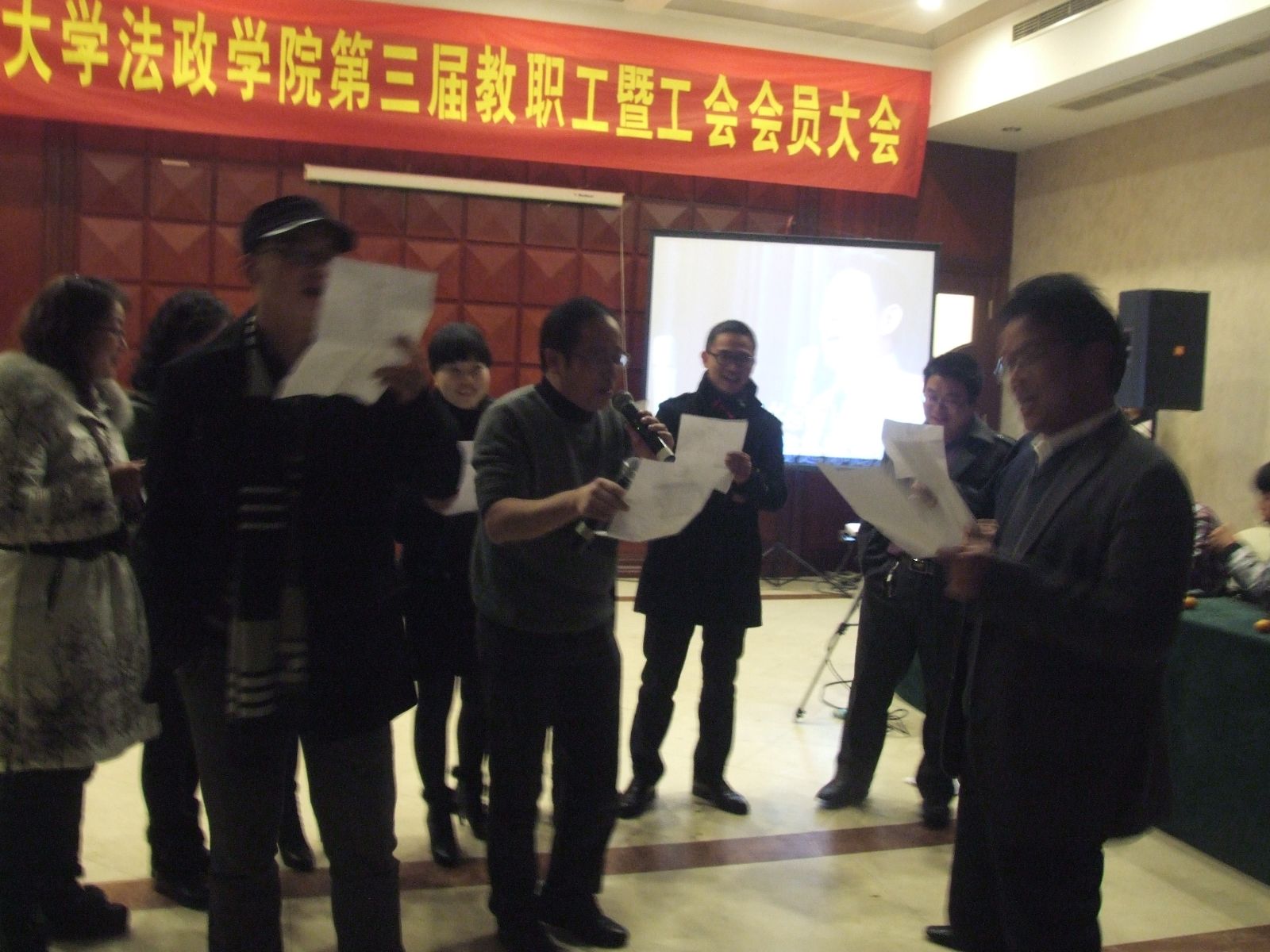 1月12日晚,一年一度的法政学院新春教师联欢晚会如期举行。本次晚会由我院陈宝胜、夏小娜老师和家属代表钭兰朵小朋友组成的三人临时家庭组合一起主持。行政、法学、行管思政三个工会小组分别表演了精心准备的集体节目。行政小组的《法政STYLE》集体舞独具特色,水平一流;法学小组则演唱由老师自己填词的歌曲,每个人都肆意释放自己,震撼全场、笑翻全场;行管思政小组带来的是《方言大杂烩》,展示的一个个配上图片的地方特色菜肴令人馋涎欲滴。此外,游戏环节和即兴表演轮番上阵,抽奖环节更是令人激动不已,热闹至极。晚会设置了组织奖,最后法学小组因为参与率高、积分领先荣获组织奖第一名。