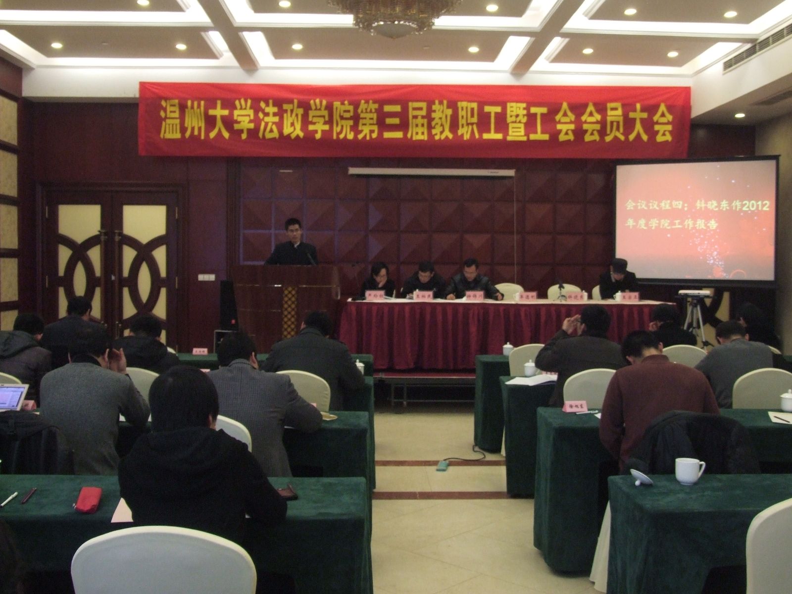 钭晓东院长作题为《凝心聚力 互哺共生 团队协同 共创持续发展的法政学院》的工作报告。钭院长指出,一年来,在校党委的正确领导下,法政学院党总支和行政班子紧密围绕学校中心任务,工作定位准确、工作思路清晰,全院上下精诚团结、凝心聚力、开拓创新、务实进取,以高度的责任感和强烈的事业心推进各项工作。学院内涵建设逐步深入,对外联系显著加强,发展环境不断改善,发展后劲不断显现。学院在人才培养、教育教学改革、学科建设、师资队伍建设、太阳成集团、党建工作等方面取得了一系列新成绩、新突破。学院的教育教学改革成果丰硕,人才培养质量进一步提升; 成果获奖、科研立项与经费稳步增长; 学科发展平台呈多元化拓展; 内生外引,师资团队实现培育与厚实;创新育人工作模式,学生思想政治工作成效显著; 扎实落实"基层组织建设年"工作,党建工作稳步推进;积极筹备"校庆工作",整合发展资源、开拓学院发展平台;高度重视宣传文化与工会建设,功能得到有效发挥。