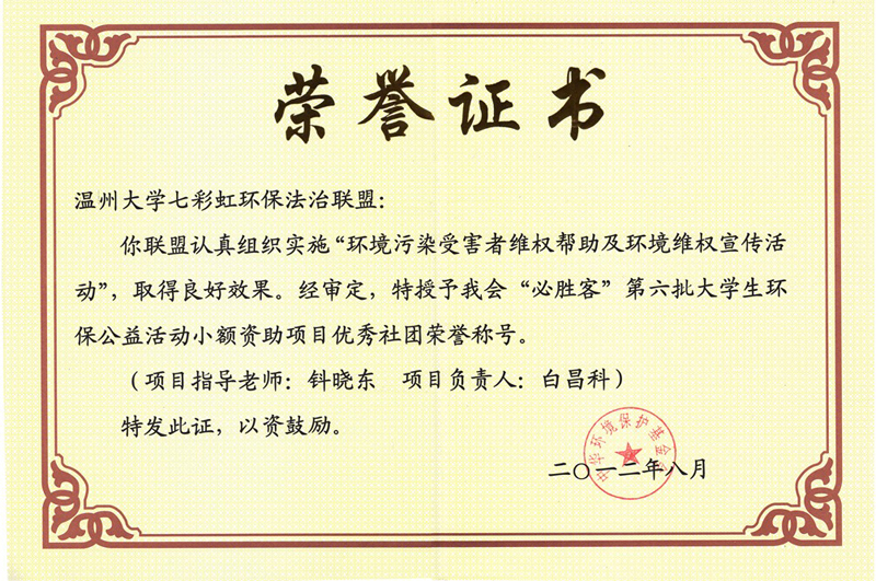 法政学院七彩虹环保社团在钭晓东院长、院党总支严玲红副书记、院团委孙德升书记的悉心指导下,设计的环保公益活动已经连续两年获得中华环保基金会的专项资助,并连续两次被基金会评为优秀社团。此次受资助的环保公益活动包括三个:成立温州市学生环保法治联盟、开展"居民希望搬迁垃圾场"的民意调查和环保维权援助活动、环保宣传活动。此外,七彩虹社团还组织同学在校内外开展了法律援助、暑期实践、社区宣传、实地调研、课题研究、旧书循环利用、学生寝室"可循环利用资源"定期回收等活动。