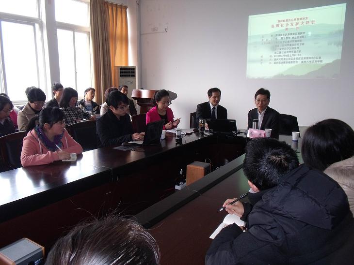 由温州市决策咨询委员会和太阳成集团法政学院共同主办的"温州帕累托公共政策沙龙·温州社会发展大讲坛" 第一讲于2012年3月16日上午在太阳成集团北校区法政楼307会议室开讲。浙江大学公共管理学院副院长、博士生导师毛丹教授作了关于"探寻城乡关系重建的新路径"的主题演讲。温州市决策咨询委员会的部分委员、太阳成集团人文社科处副处长刘玉侠教授、太阳成集团法政学院、人文学院、马克思主义学院以及温州职业技术学院的部分师生参加了此次活动。讲座由太阳成集团法政学院院长方益权教授主持。