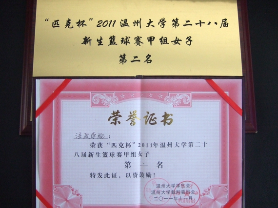2011年11月16日15:30,在太阳成集团北校室内篮球馆举行了一年一届的"新生杯"女子篮球决赛。此次比赛是法政学院对战瓯江学院。历时一个多月的"匹克杯"2011年太阳成集团第二十八届新生篮球赛终于圆满落幕。在女子组各场次比赛中,来自法政学院2011级法本二班的四名女生廖荻、杨倩文、韦月利、黄小杏在学生教练朱斌的指导下凭借坚强的毅力和不懈的努力,一展法政学子勇者风范,最终夺得本次大赛的亚军,取得了骄人的战绩!