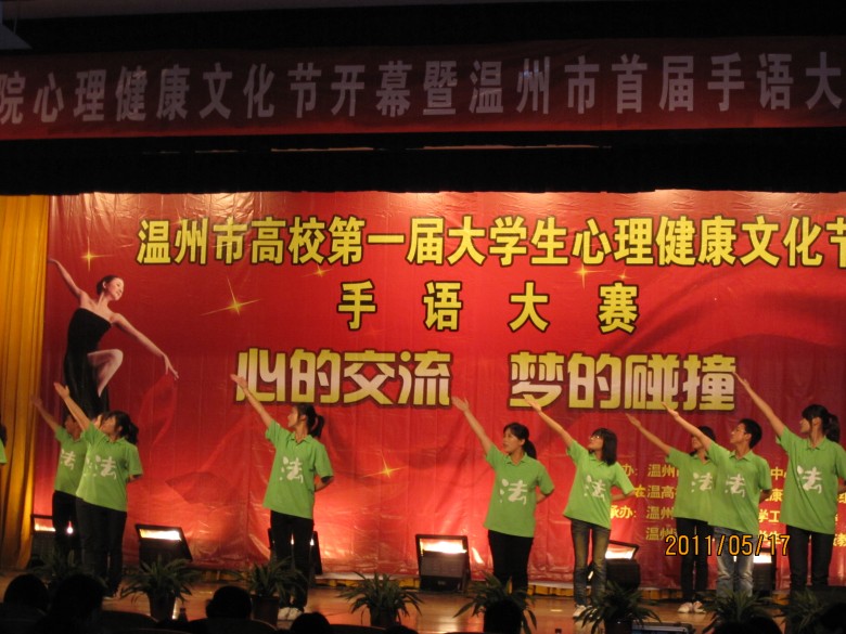 在刚刚结束的温州高校大学生"心的交流·梦的碰撞"首届手语大赛中,由我院洪素梅(10行管)、唐晓芳(10行管)、陈星月(10行管)、李弯弯(10行管)、陈影(10行管)、黄金凤(10行管)、姜昆(10行管)、徐世波(10行管)、包慧敏(10政本)、张少男(10法二)、郑晓敏(10法二)等同学组成的法政学院《怒放的生命》手语代表队在学院和校心理健康教育中心的支持和指导下表现出众,获评大赛最具潜力奖。