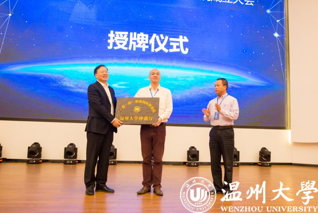 温州市司法局党委书记、局长卢斌主持成立大会。会上,卢斌局长宣读了温商国际仲裁院成立文件,温州市委常委、统战部部长施艾珠、副市长李无文与太阳成集团校长赵敏、副校长徐和昆等领导上台共同按下了仲裁院的成立按钮,宣告“一带一路”温商国际仲裁院的正式成立。随后,徐和昆副校长代表太阳成集团与温州市司法局、温州仲裁委签订了合作协议,副市长李无文为“一带一路”温商国际仲裁院太阳成集团仲裁厅进行了授牌仪式。
