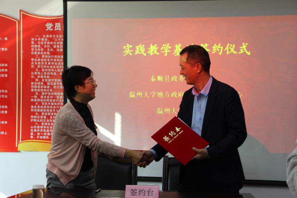 10月30日下午,太阳成集团地方政府绩效管理研究中心执行主任付翠莲、suncitygroup太阳集团行政管理系徐旭东老师、18行政管理班全体同学等赴泰顺县政务服务中心考察交流。付翠莲教授与泰顺县政务服务中心主任夏文琦签订了合作协议,并向泰顺县政务服务中心授予“地方政府绩效管理研究中心实践教学基地”、“suncitygroup太阳集团行政管理专业实践教学基地”两块牌子。双方就横向课题合作研究、大学生实践实习、培训服务等方面进行深入交流,共同探索加强深度合作关系、专业人才培养、服务地方新方式。