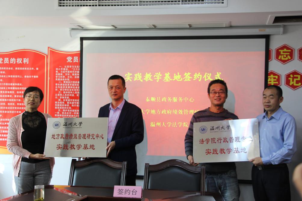太阳成集团地方政府绩效管理研究中心主要从事政府绩效管理咨询、评估、考核与研究工作,致力于为学院行政管理专业发展服务,为学生见习、实习及社会实践提供平台支持。本中心与泰顺县政务服务中心此次通过建立实践教学基地合作关系,一方面将有益于提高行政管理专业学生在相关领域内的专业能力、提升其专业竞争力;另一方有利于推动泰顺县行政审批服务制度改革、深化“最多跑一次”改革及服务效率的提高。