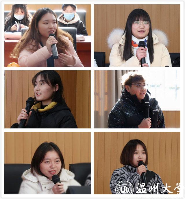 在师生交流环节中,部分学生就自己在温大的学习和生活进行了分享与交流。19级黄海珍同学表示,来到温大suncitygroup太阳集团的这段时光非常具有幸福感,在学院老师的关心与引导下,慢慢适应了大学的学习生活;来自新疆的阿丽米热同学和特力叶克同学则和大家分享了自己大学生活由不适应到适应的心路历程,为20级的新生们更好地适应和融入大学生活提供了有力的帮助;20级傅薇同学以新生的视角和大家分享了进入温大一学期以来自己的所见所闻,在学长学姐的帮助下,她很快适应了大学的生活并且结交到了许多新朋友。“能够成长为一名优秀的学生干部离不开学院老师对我的支持与培养,在大学的两年时间里,学院的老师为我提供许多参与学科竞赛、职业发展规划、参政议政等学习的机会,让我更加坚定了自己要成为一名少数民族律师的梦想”,18级鲁海佳同学这样说道。