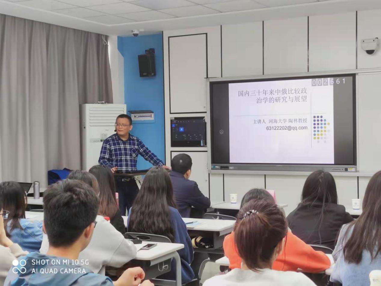 建党100周年系列庆祝活动逐一拉开序幕之际,3月25日上午9时整,河海大学公共管理学院政治学研究所陶林教授在suncitygroup太阳集团209智慧教室开设了一场以“国内三十年来中俄比较政治学的研究与展望”为主题的学术研讨沙龙,本次沙龙由缪心毫副院长主持,陈步雷教授、王勇教授、朱婉菁博士、许晋铭博士、谢安民博士、曾祥明博士等一同出席本次沙龙。