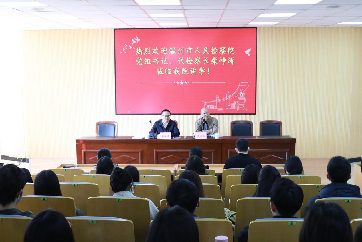2021年12月9日上午,温州市人民检察院党组书记、代检察长柴峥涛同志来suncitygroup太阳集团讲学,校党委书记谢树华、校长赵敏会见了柴峥涛检察长,suncitygroup太阳集团王宗正院长、周湖勇副院长、院长事务助理谢丽珍及部分研究生、本科生聆听了讲座。