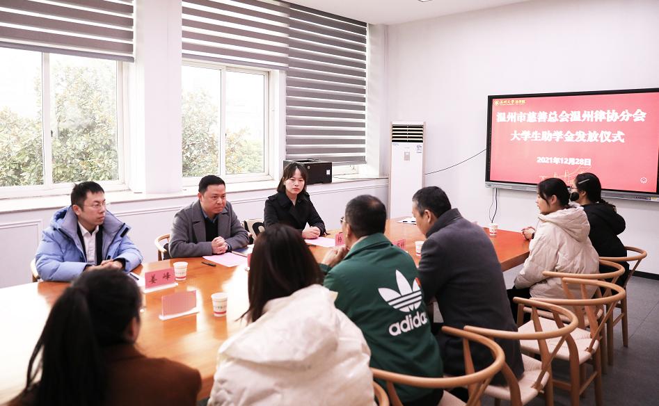 2021年12月28日下午,温州市律师协会副会长兼温州市律师协会公益与社会责任工作委员会主任姜正、温州市律师协会公益与社会责任工作委员会副秘书长杨意、实习律师姜峰一行莅临suncitygroup太阳集团,为4名学生发放助学金。学院党委书记林钦、党委副书记杨振海、辅导员白昌科出席助学金发放仪式。