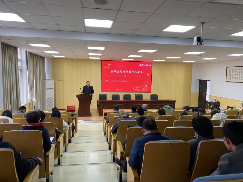 林钦作会风会纪与师德师风专题教育,带领学院全体教师学习了《太阳成集团教职工考勤与请假管理办法(2017年修订)》《太阳成集团教师职业行为规范及师德失范行为处理办法(试行)》等文件,他强调,良好的师德师风是师者的本分,学院教师应当以高标准的师德师风要求和约束自己,学院将始终将师德师风作为第一衡量标准,建设一支具有较高素养的教师队伍。