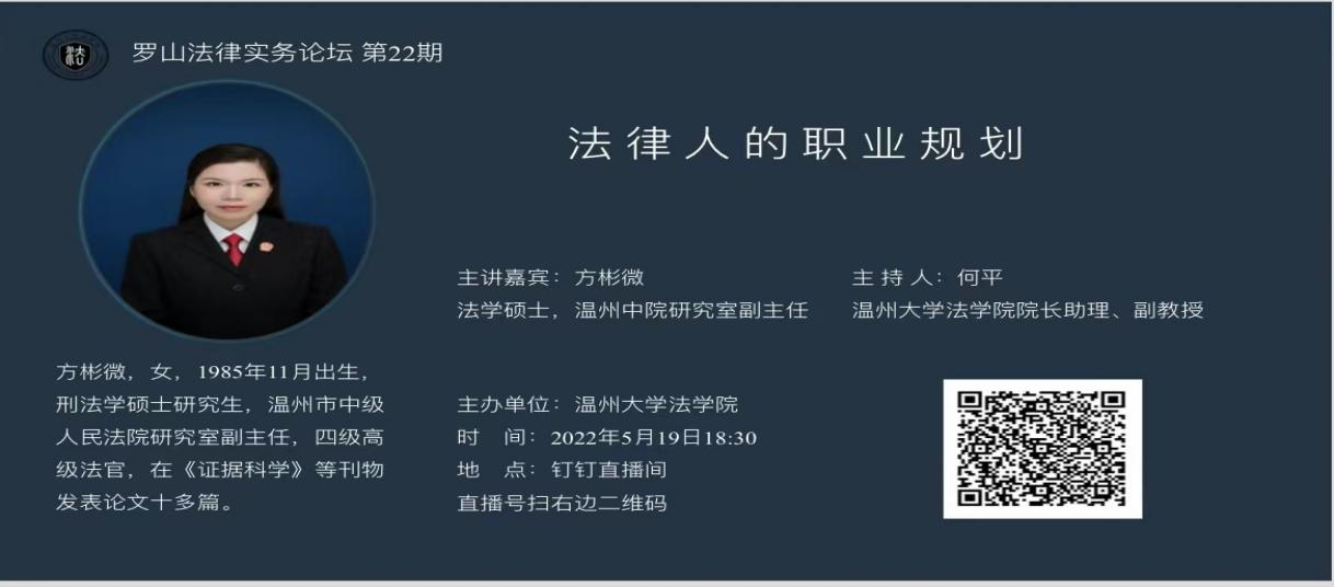5月19日晚上,温州市中级人民法院研究室副主任方彬微法官在钉钉直播给我们学生做了一场主题为《法律人的职业规划》的讲座,suncitygroup太阳集团院长助理何平老师主持。