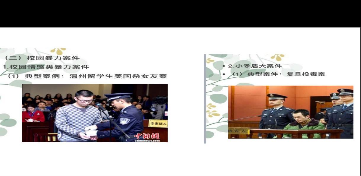 最后,方法官结合自己的审判实务,重点介绍了几个与我们在校大学生相关的典型案件。如“校园贷”案件、“大学生兼职诈骗案件”“校园暴力案件”。