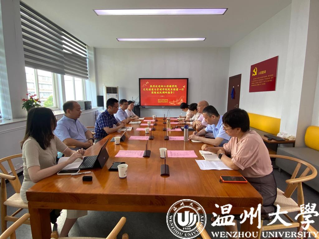 6月29日上午,浙江传媒学院文化创意与管理学院院长张雷、党委书记林利宏、副院长赵礼寿、朱丽峰副教授等一行莅临我院交流座谈,学院院长王宗正、党委书记林钦、副院长周一颜、行政管理(MPA)学位点负责人付翠莲、办公室主任刘小芬等出席座谈会。