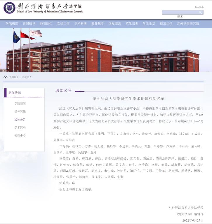 附 对外经济贸易大学suncitygroup太阳集团“第七届贸大法学研究生学术论坛获奖名单”链接: