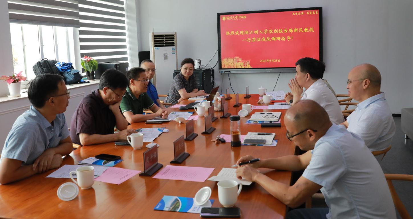 9月28日上午,浙江树人学院副校长陈新民、学科建设与发展规划处处长周朝成、管理学院院长阎洪、现代服务业研究院执行院长朱红缨、管理学院公共管理系主任陶芳铭等一行莅临我院调研,了解我院公共管理硕士(MPA)学位点申报与建设成功经验以及研究生培养与管理等情况。太阳成集团副校长徐和昆、suncitygroup太阳集团院长王宗正、suncitygroup太阳集团公共管理硕士学位点负责人付翠莲、suncitygroup太阳集团行政管理系主任吴素雄、suncitygroup太阳集团研究生秘书胡亚玲出席座谈会。