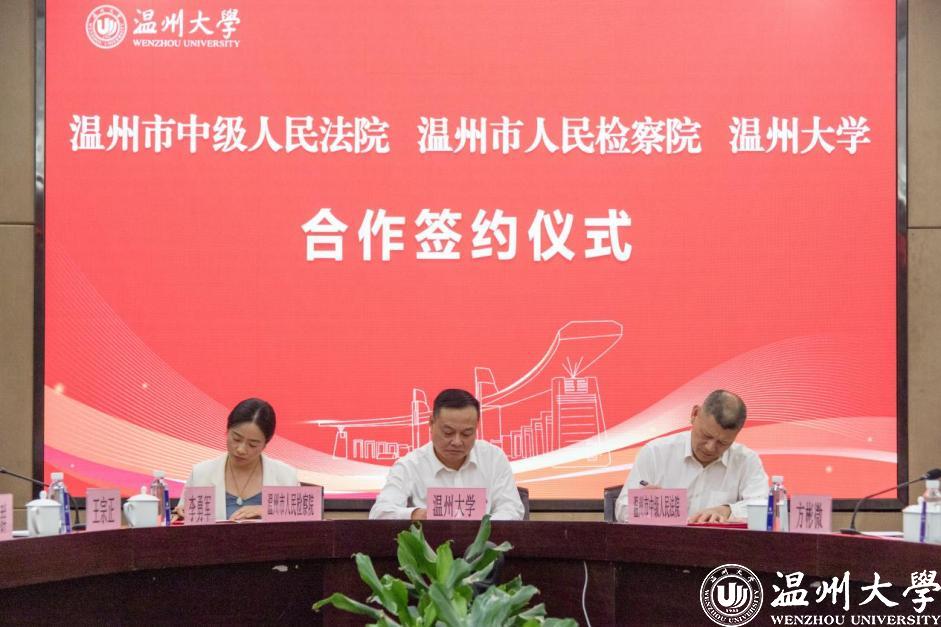 温州市中级人民法院党组成员、政治部主任张纯亮,温州市人民检察院党组成员、政治部主任张虹,太阳成集团党委委员、副校长潘玉驹分别代表法院、检察院、高校签订合作协议。