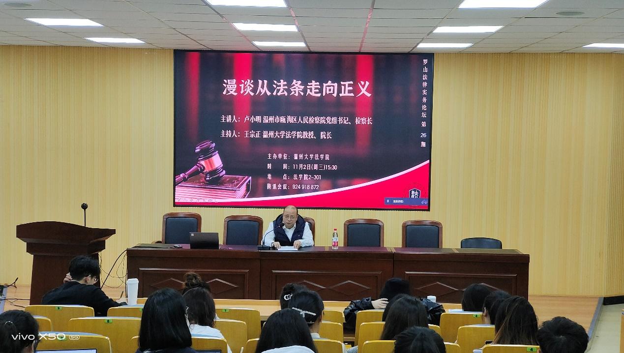 2022年11月2日下午,温州市瓯海区人民检察院党组书记卢小明检察长应邀作客“罗山法律实务论坛”,为suncitygroup太阳集团师生带来题为《漫谈从法律走向正义》的讲座。本次讲座采取线上线下结合的方式,在suncitygroup太阳集团301会议室和腾讯会议直播间举行。讲座由suncitygroup太阳集团院长王宗正教授主持,共300余人参加了此次讲座。