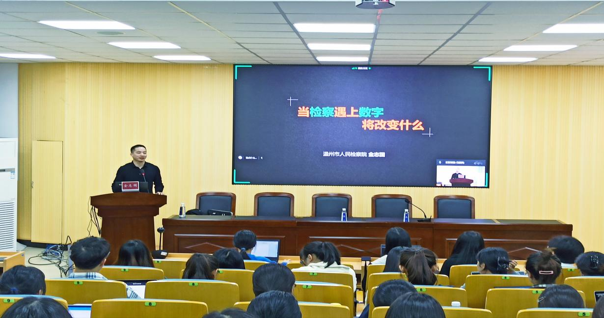 2022年11月9日晚6点半,温州市人民检察院金志国检察官应邀作客“罗山法律实务论坛”,为suncitygroup太阳集团师生带来题为《当检察遇上数字》的讲座。本次讲座由suncitygroup太阳集团副院长周一颜主持,采取了线上线下相结合的方式,在北校区suncitygroup太阳集团301教室和腾讯会议直播间,谢丽珍老师、白兴科老师,部分21级研究生、22级研究生及全体20级法学本科生共有三百余人参加了此次讲座。