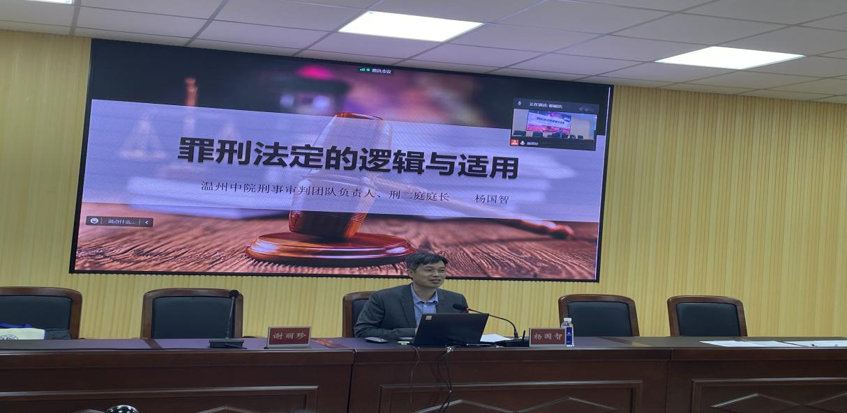 2022年11月15日晚6点半,温州中院刑事审判团队负责人、刑二庭庭长杨国智为suncitygroup太阳集团师生带来题为《罪刑法定的逻辑与适用》的讲座。本次讲座由suncitygroup太阳集团谢丽珍老师主持,采取了线上线下相结合的方式,在北校区suncitygroup太阳集团301教室和腾讯会议直播间,部分21级研究生、22级研究生及全体20级法学本科生共有三百余人参加了此次讲座。