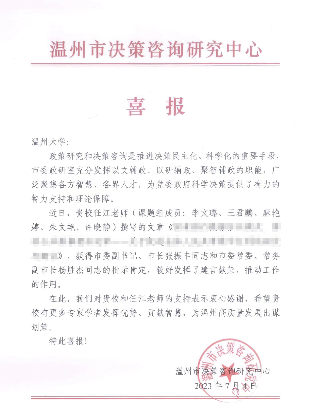 对策建议报告依托任江副教授课题组承担的中共温州市委政策研究室决策咨询与政策研究课题完成,课题组成员包括李文璐、王君鹏、麻艳婷、朱文艳、许晓静五位我院在读法学(法律)硕士研究生,现已结项。该对策建议报告与课题的完成,也是我院“产教学研”深度融合发展理念的又一成果。未来,学院将进一步推动各研究平台(中心),在立足科研的同时,更加积极地参与建言献策与研究生培养工作,促进学院教学、科研、服务地方与人才培养的共进式发展。